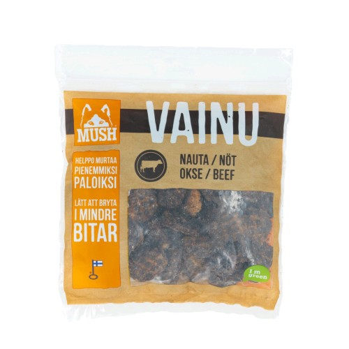 MUSH VAINU® Nautanami – suosittu namipussi saatavilla nyt myös nautavaihtoehtona. Sama koostumus ja muoto kuin Possu- ja Kananameilla. Sopivat hyvin herkutteluun, koulutukseen tai välipalaksi. Proteiini 48,3 % ja rasvaa 42,3 %.